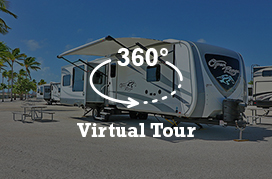 These vacation trailers are fully furnished and have two slides that expand the living space. Some have a front porch, others a side porch. All are fully furnished and have a full kitchen, bath, sleeper sofa in the living area, and outdoor space for a small, kid-size tent. Picnic tables are available.